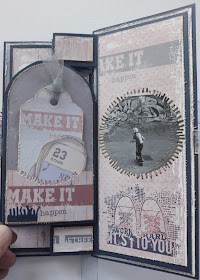 Als mal heb ik een doosje met kinderchocolade gebruikt. Eerst heb ik het doosje nagetekend op wit cardstock en alle lijnen gerild. Daarna heb ik het designpapier op maat gemaakt en opgeplakt. Uit de voorkant van het doosje heb ik met de blauwe mal Happy Birthday een gat gestanst. Achter het gat heb ik een mica ruitje geplakt.